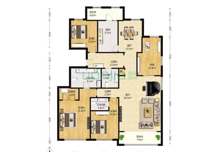 户型方正,泛海国际兰海园二手房,2300万,3室2厅,2卫,193平米-北京安居