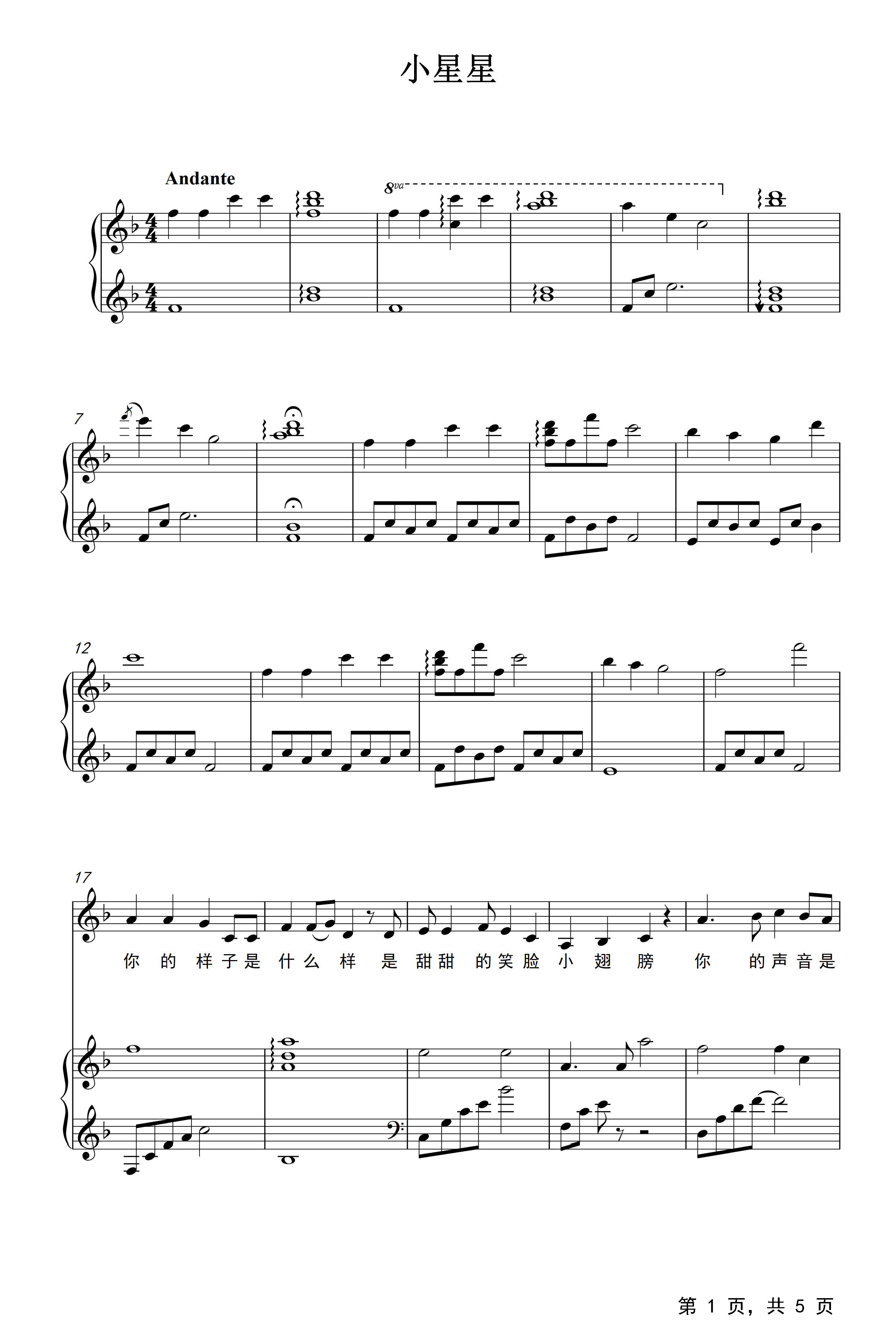 小星星钢琴谱汪苏泷f调流行钢琴五线谱