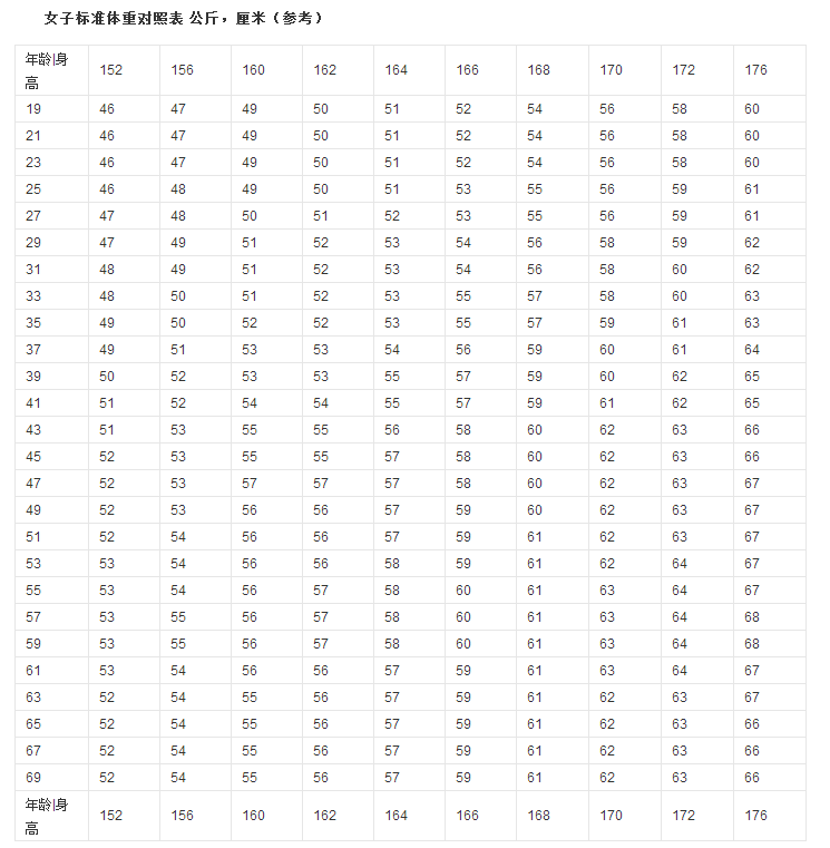 1969岁男女体重标准对照表你达标了没显瘦还是显胖