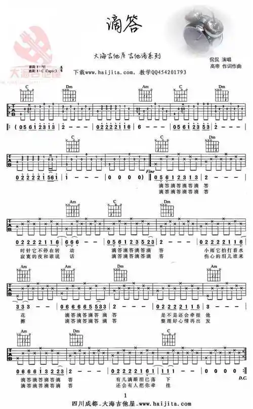 嘀嗒吉他谱(图片谱,弹唱,分解和弦)_侃侃_嘀嗒01.gif