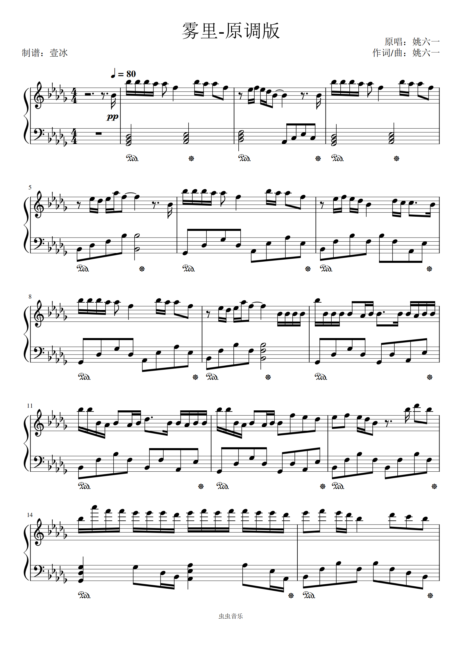 雾里//姚六一-原调版,雾里//姚六一-原调版钢琴谱,雾里//姚六一-原调