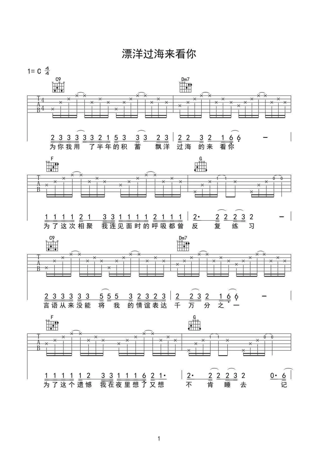 漂洋过海来看你_漂洋过海来看你简谱_漂洋过海来看你吉他谱_钢琴谱-查