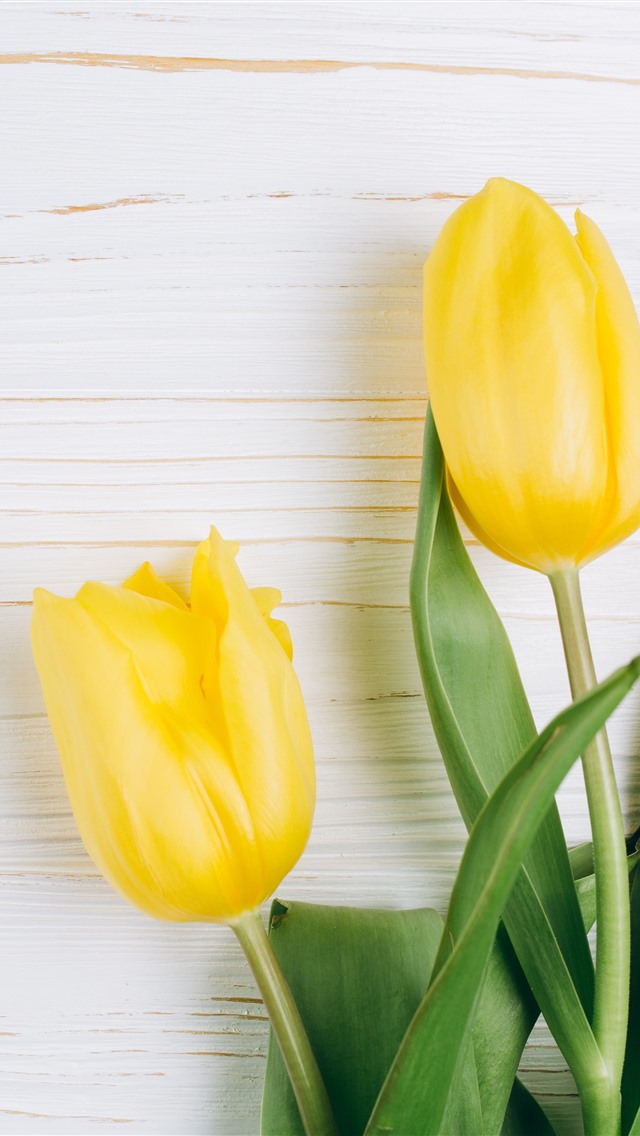 三朵黄色郁金香,绿色叶子,木背景 5k