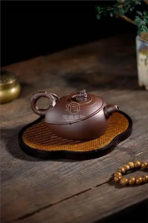牟锦芬紫砂壶作品|原矿紫泥金鼠抱竹壶360cc手工真品价位