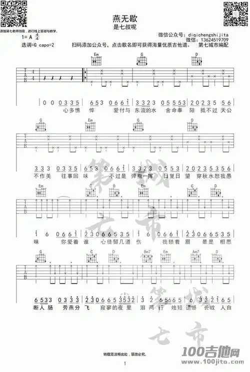 《燕无歇吉他谱》_是七叔呀_吉他图片谱3张 图1