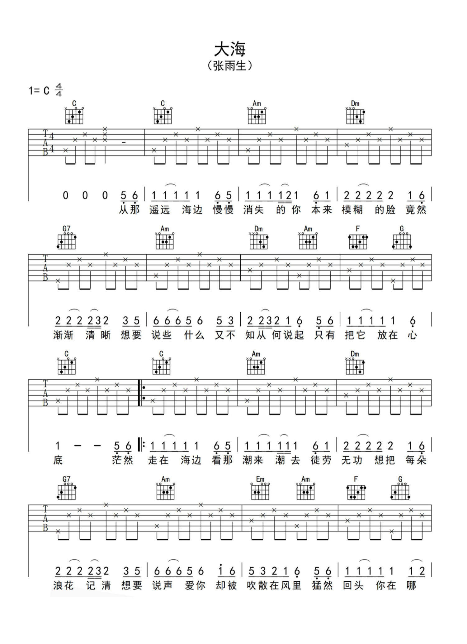 张雨生大海吉他谱c调吉他弹唱谱入门版