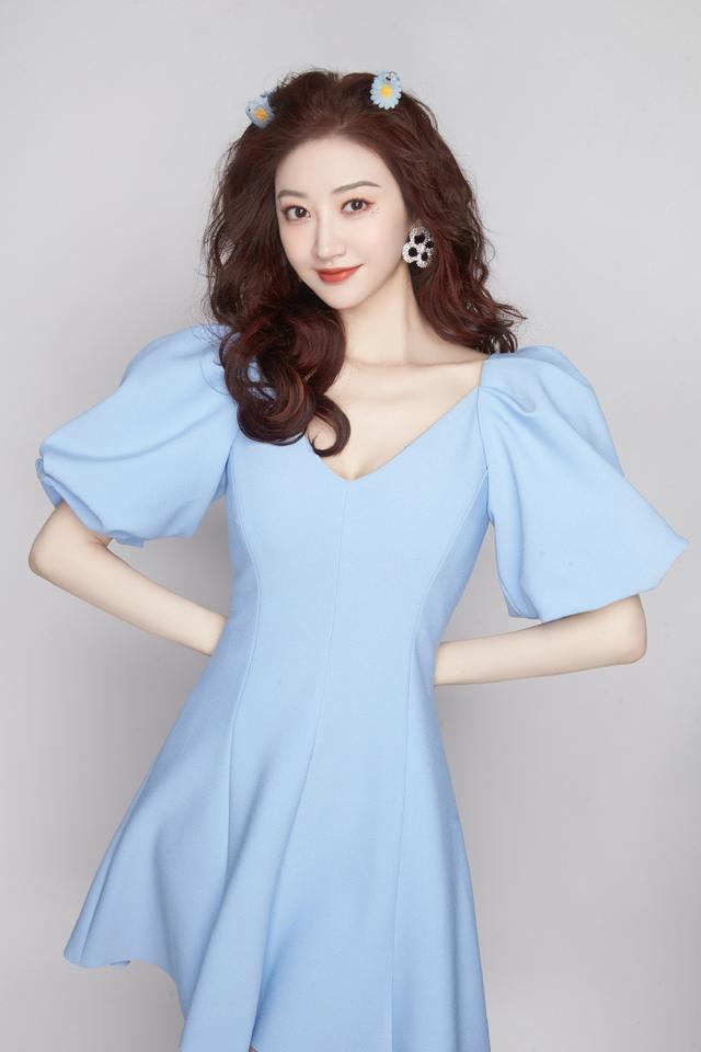 照片中的景甜留一头大波浪卷发,头戴两朵小雏菊头饰,她身穿淡蓝色泡泡