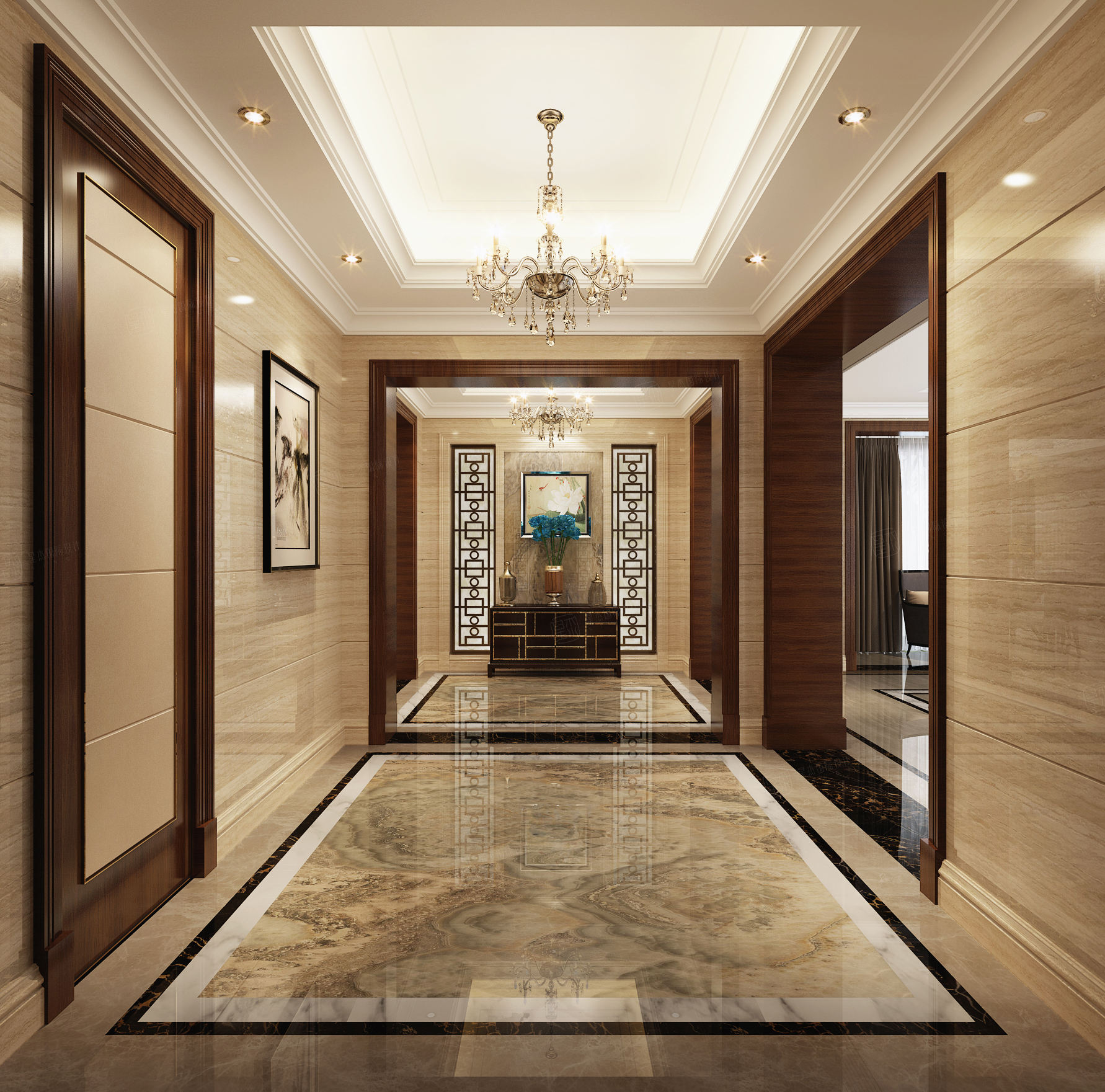 绵州水郡四层别墅欧式轻奢设计方案一层入户门厅选择严谨风格的低柜