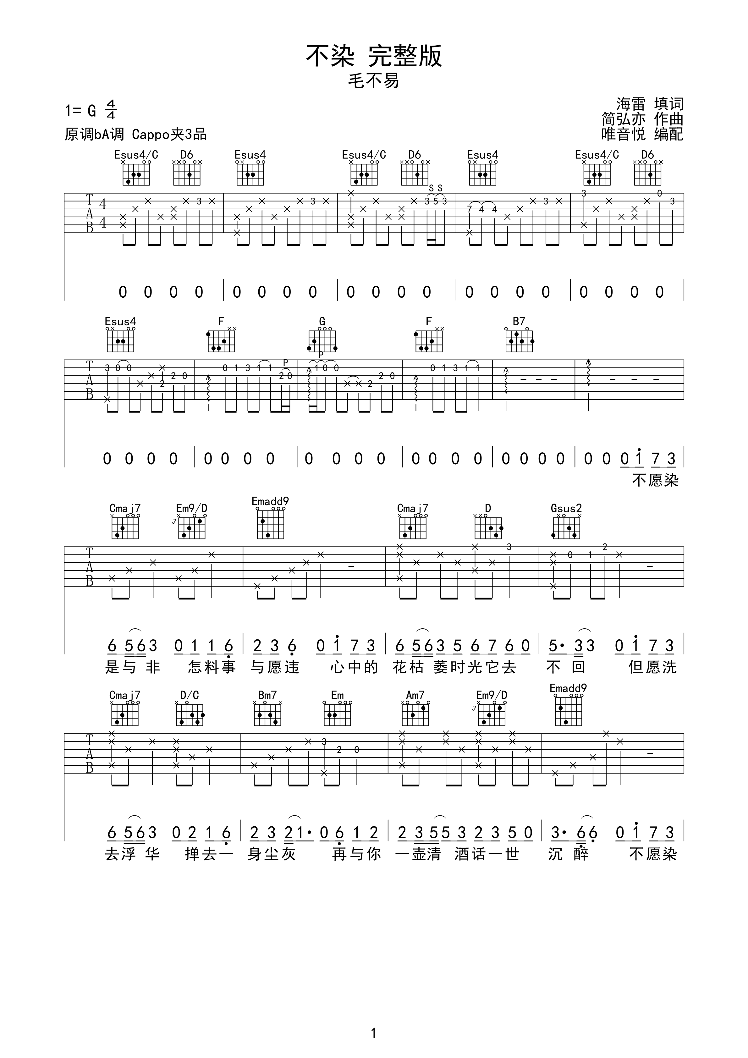 《不染》原创简谱,毛不易演唱 - 吉他贝司 - 器乐谱 - 词曲网(原名