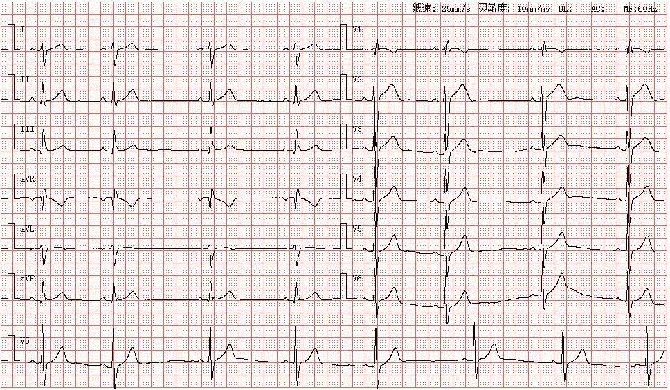 图为其心电图结论:窦性心律房性早搏完全性左束支传导阻滞分析:分析