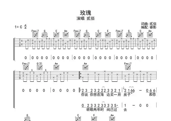 玫瑰吉他谱贰佰c调六线谱高清弹唱谱