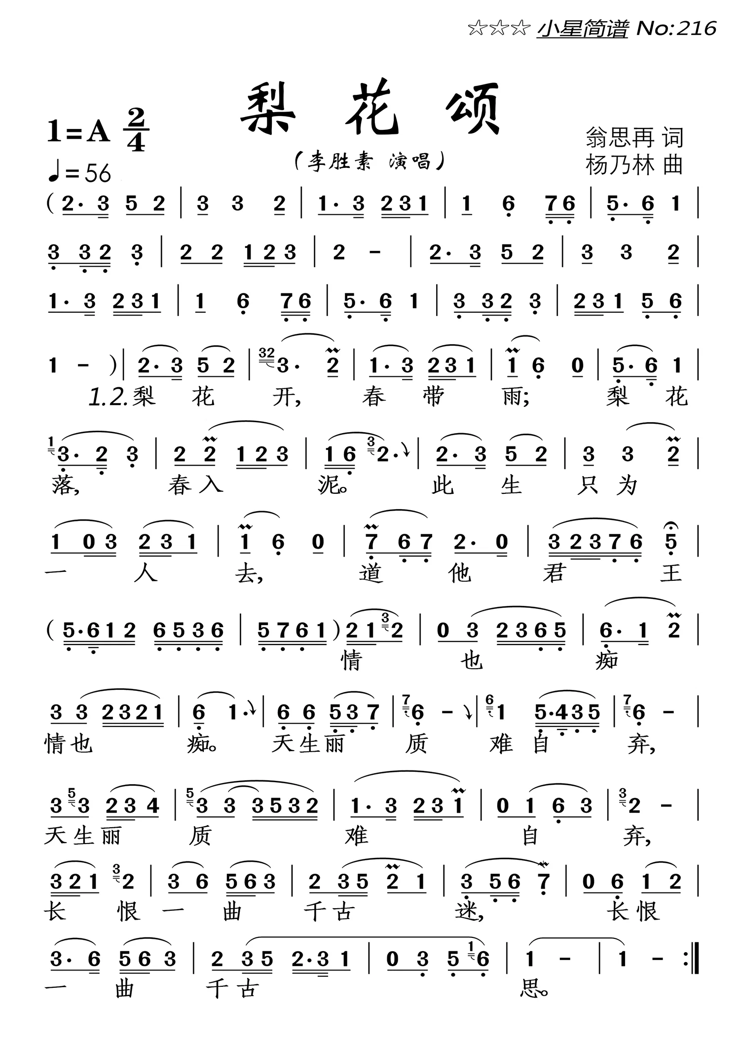 梨花颂(李胜素演唱)简谱-通俗曲谱-爱曲谱网