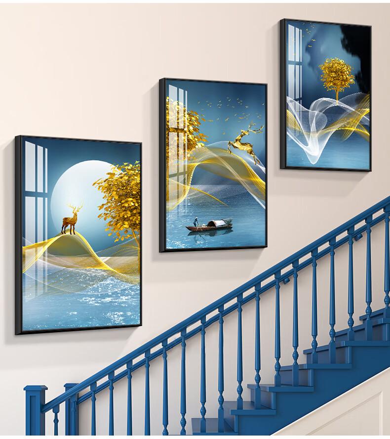 祥盈升楼梯墙壁挂画山水画复式楼梯间装饰画现代简约楼道三联挂画客厅