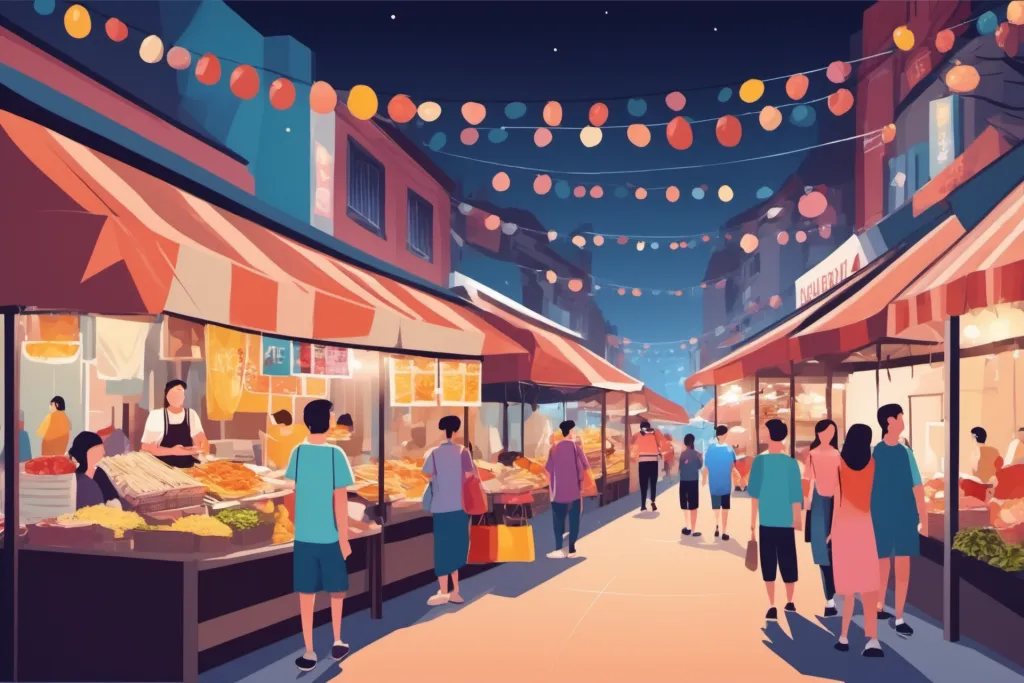 矢量购物逛街集市场景插画图片