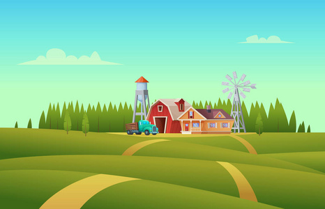 农村夏季景观与红棚农场, 房子, 卡车, 水塔和风车照片