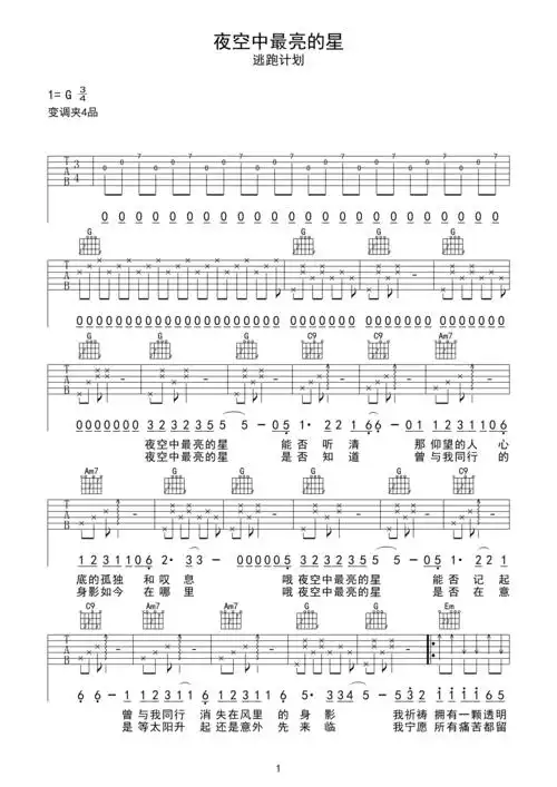 逃跑计划夜空中最亮的星吉他谱g调