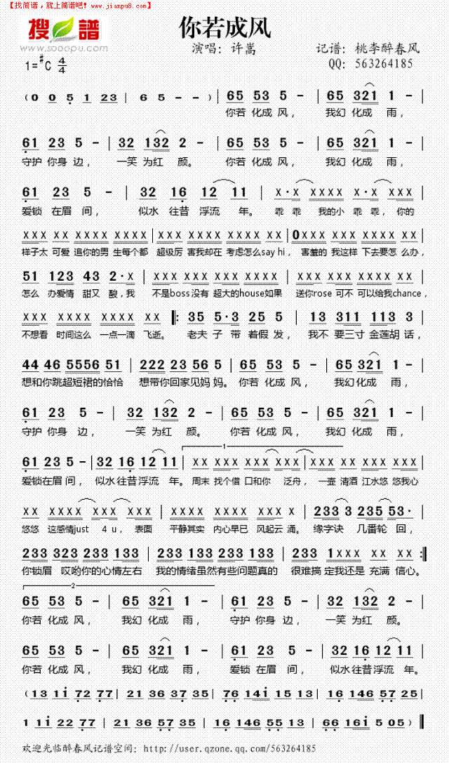 你若成风_歌谱简谱_哆来咪123曲谱网