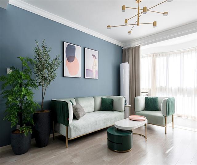 女业主喜欢蓝色 沙发背景墙便空出一面做了饱和度低的雾霾蓝色