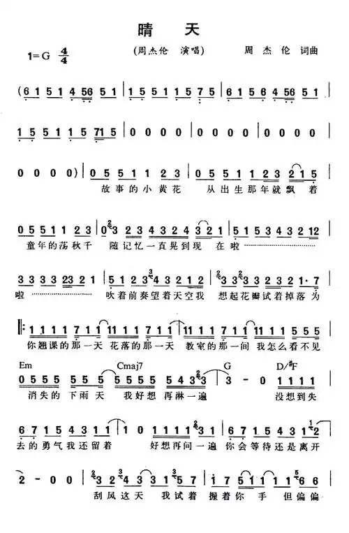 >>晴天-周杰伦 原版指法编配