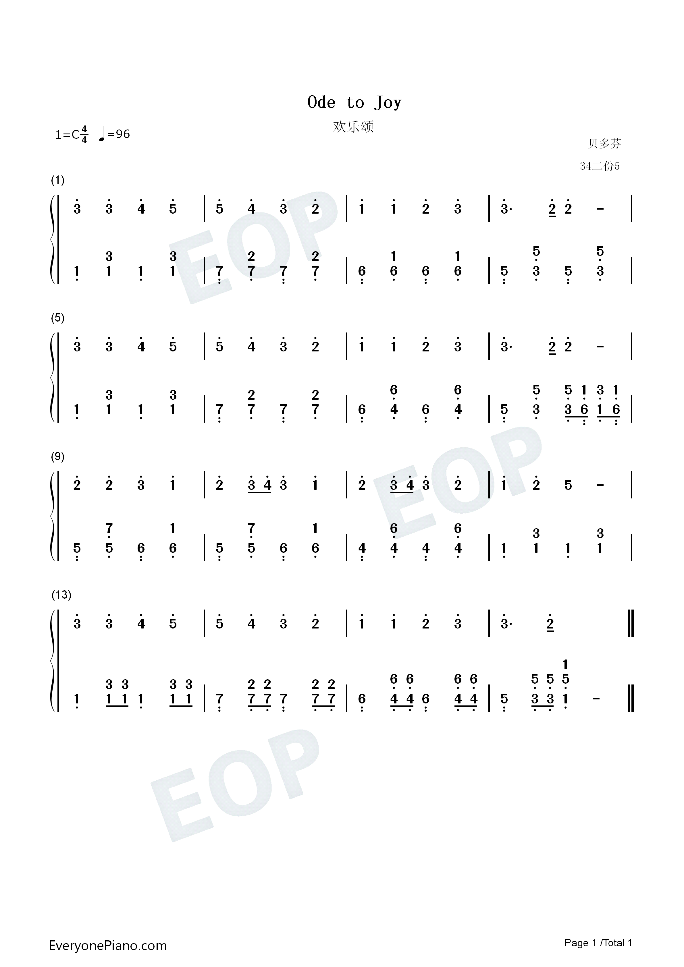 欢乐颂-song of joy双手简谱预览