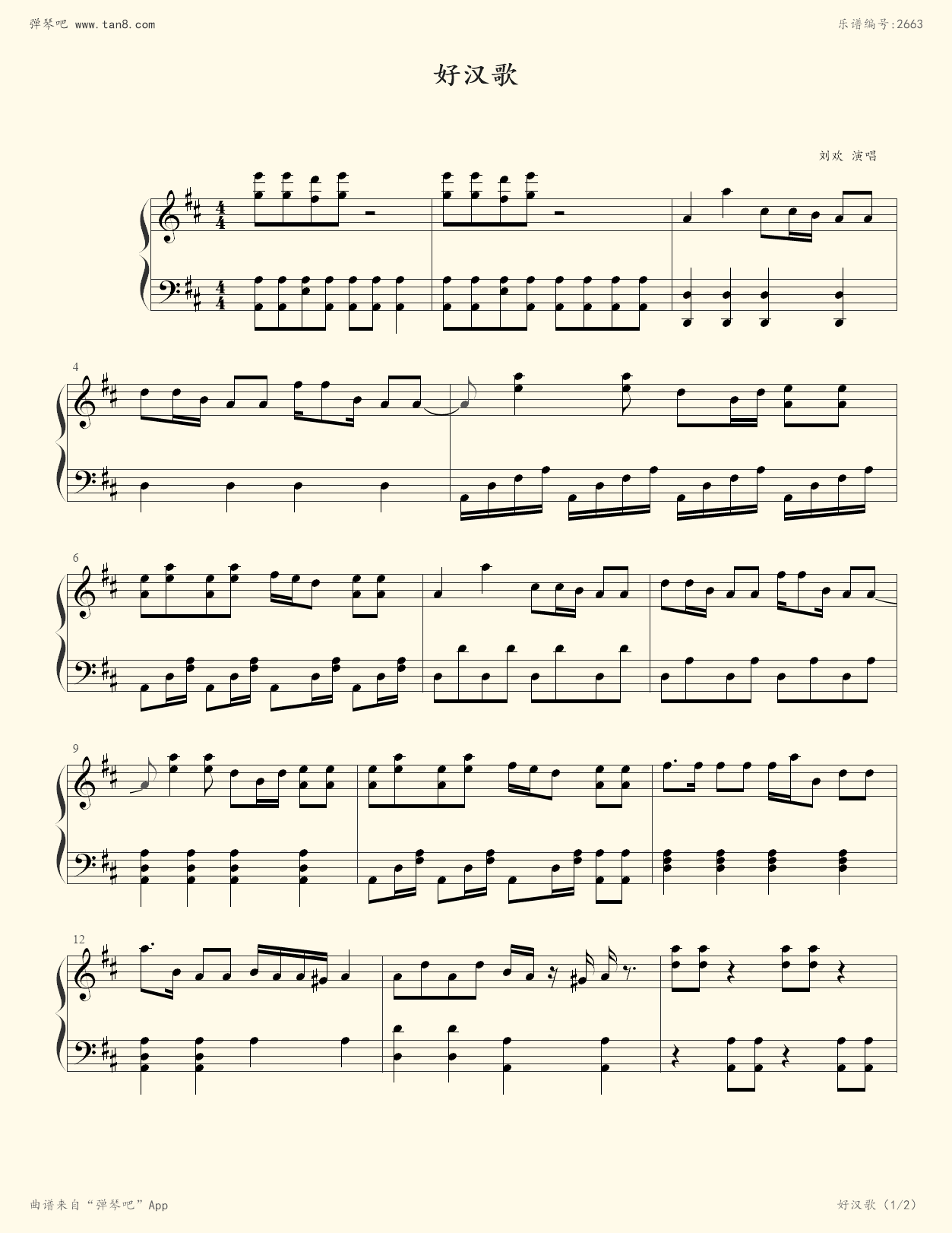 《好汉歌,钢琴谱》赵季平/刘欢(五线谱 钢琴曲 指法)-弹吧|蛐蛐钢琴网