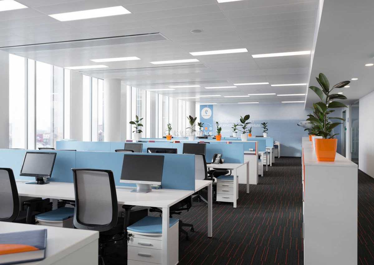 开放办公开放办公开放办公空间天花板裸顶喷漆,与灰色防尘地毯颜色相
