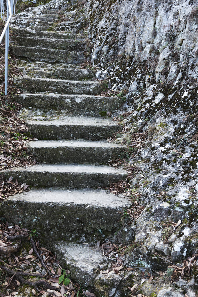 石水泥台阶的旧楼梯,有风化和破坏的痕迹.