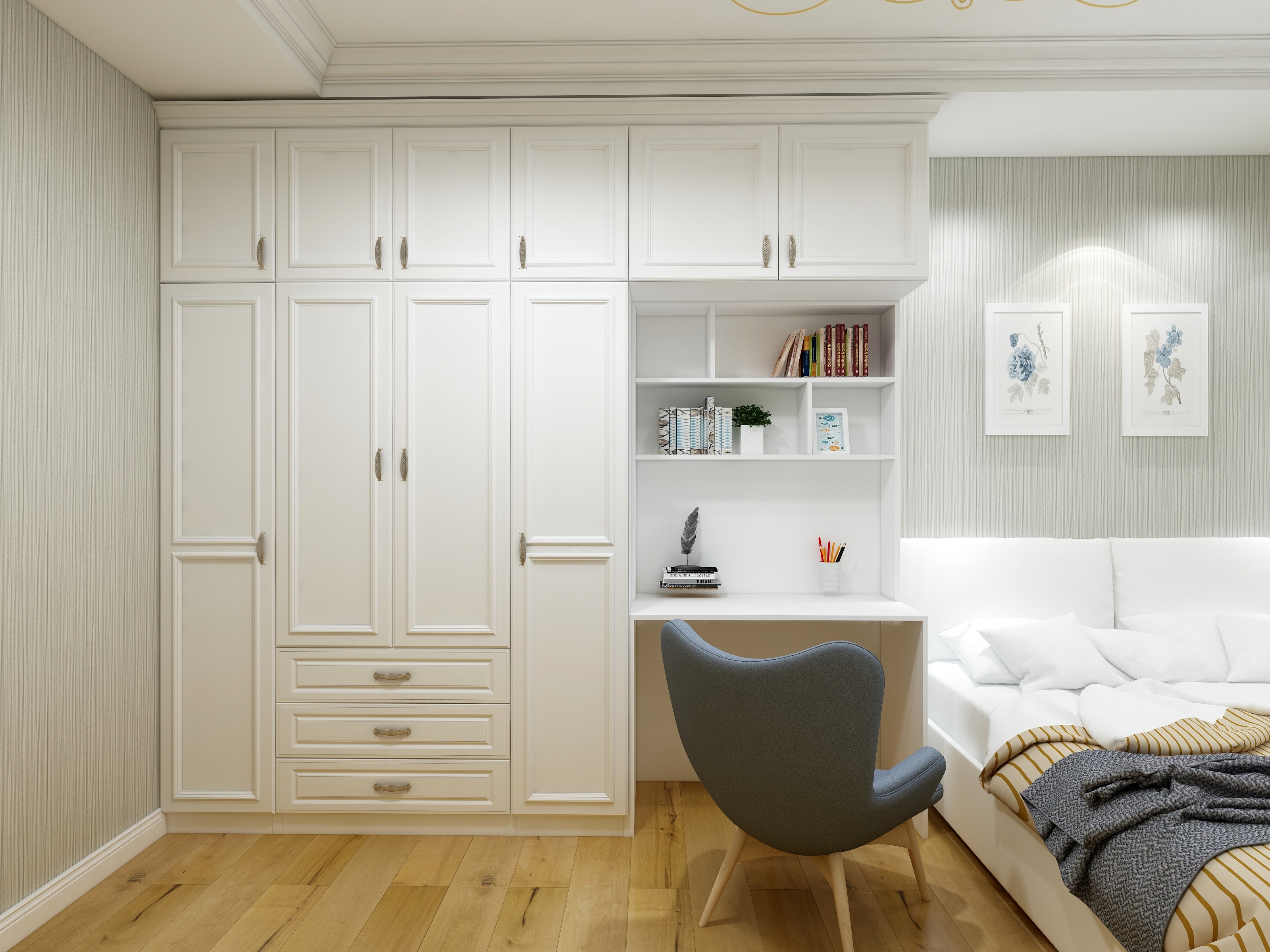 主卧衣柜也是采用简美风格的白色门板,再配一个北欧轻奢风的床头吊灯