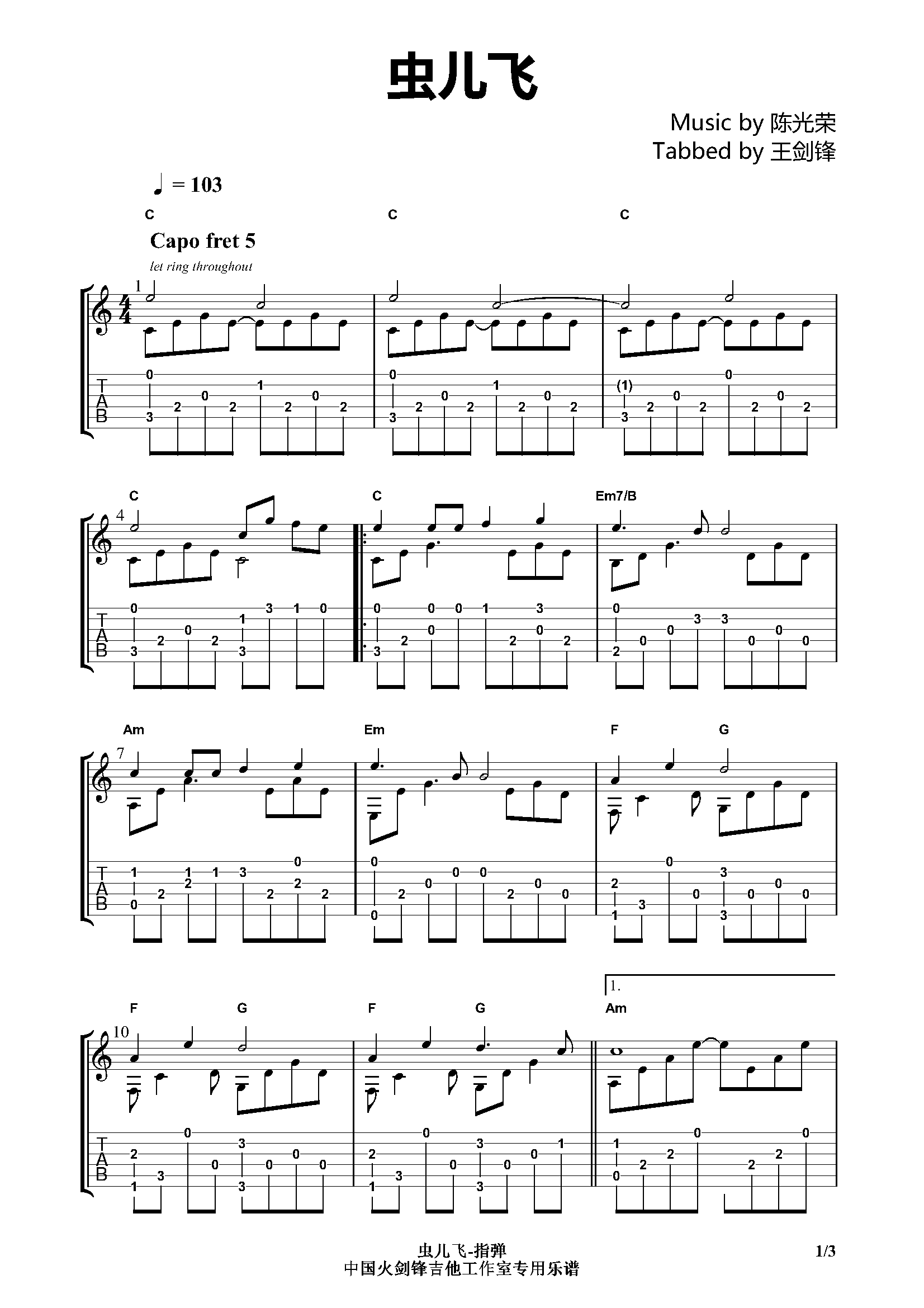 虫儿飞-木吉他指弹改编电影风云插曲童声合唱f调六线吉他谱-虫虫吉他