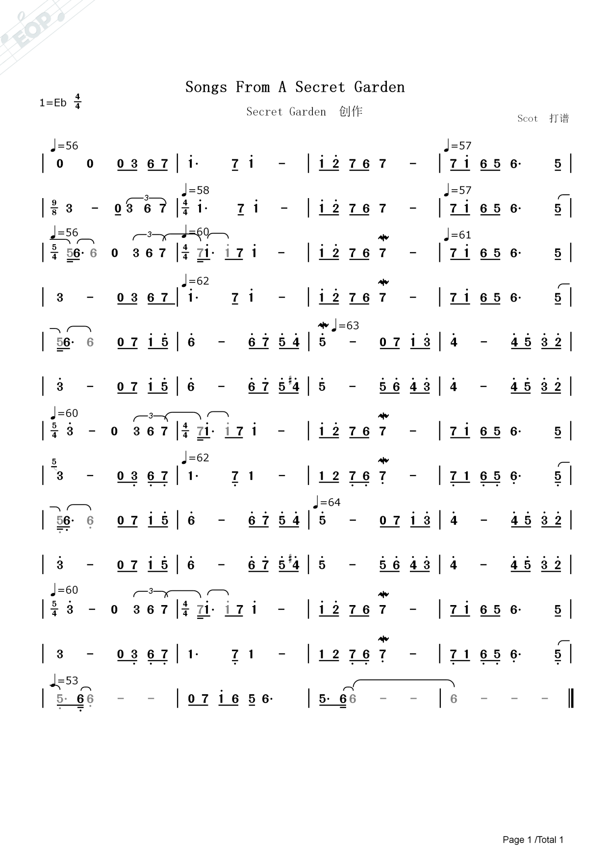 「纯音乐」songs from a secret garden-神秘园乐队制作-动态简谱