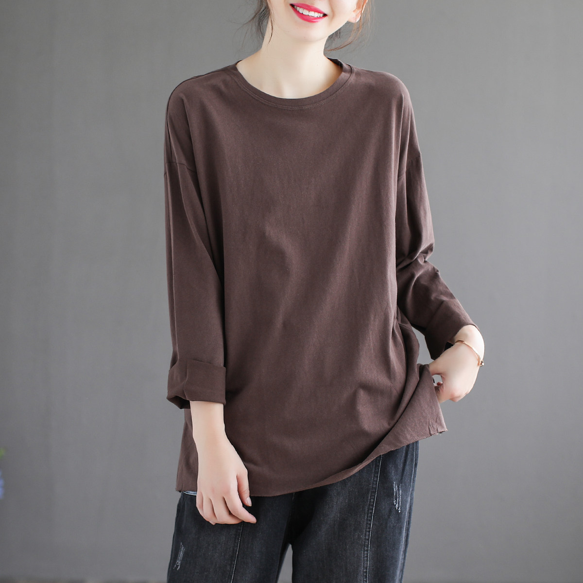 棉纯色v领t恤衫女士秋季新款下摆抽绳宽松休闲长袖复古上衣
