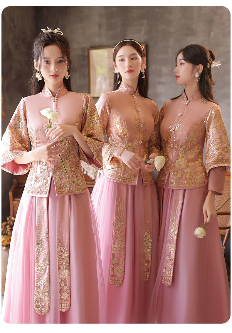 出租中式伴娘服2021新款立领粉灰色复古结婚古装团礼服姐妹裙租赁