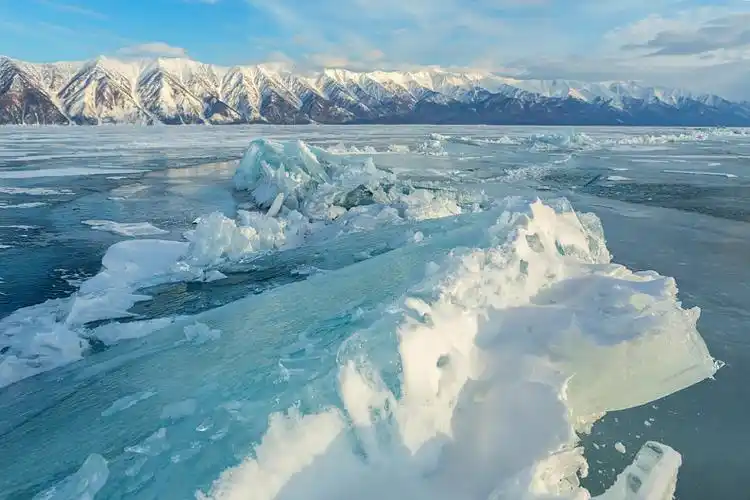 远处的山峰,湖面,冰块形成了漂亮的风景