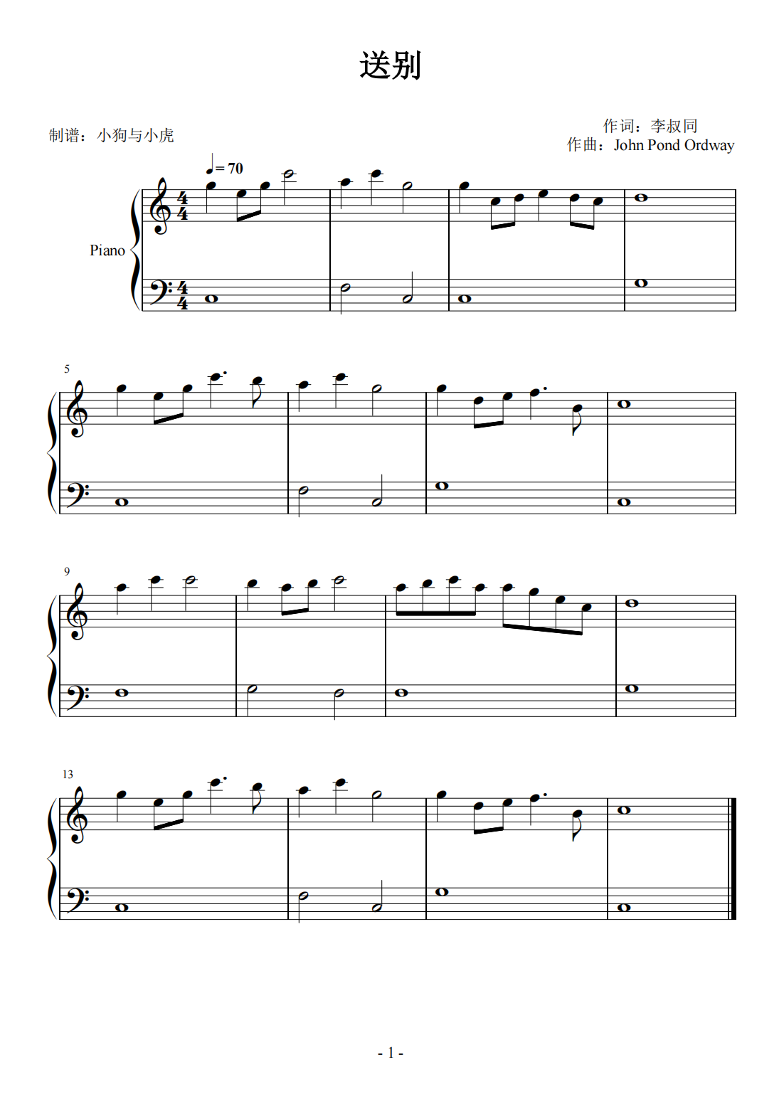送别 简易版 c调钢琴谱-虫虫钢琴