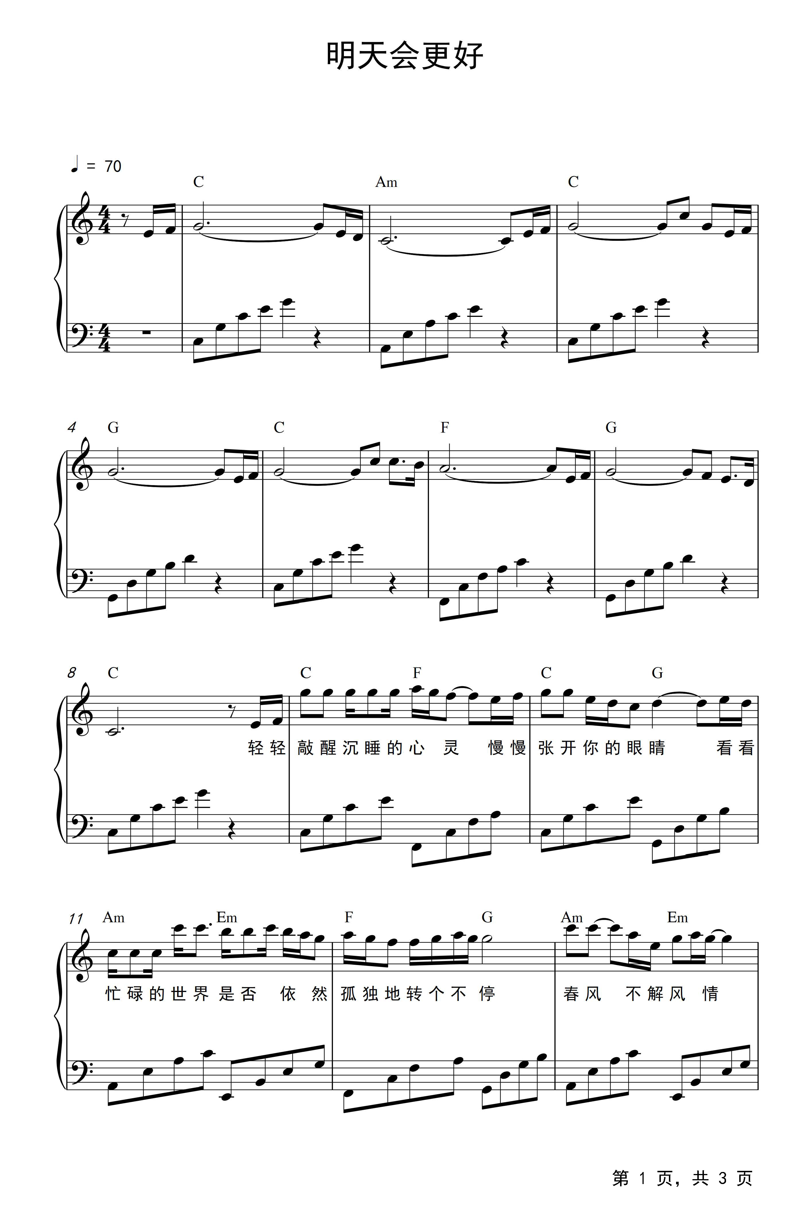 明天会更好钢琴谱罗大佑c调流行钢琴五线谱
