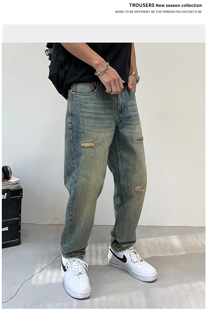 夏季浅色破洞牛仔裤男薄款复古宽松男裤潮牌美式高街直筒裤子男款