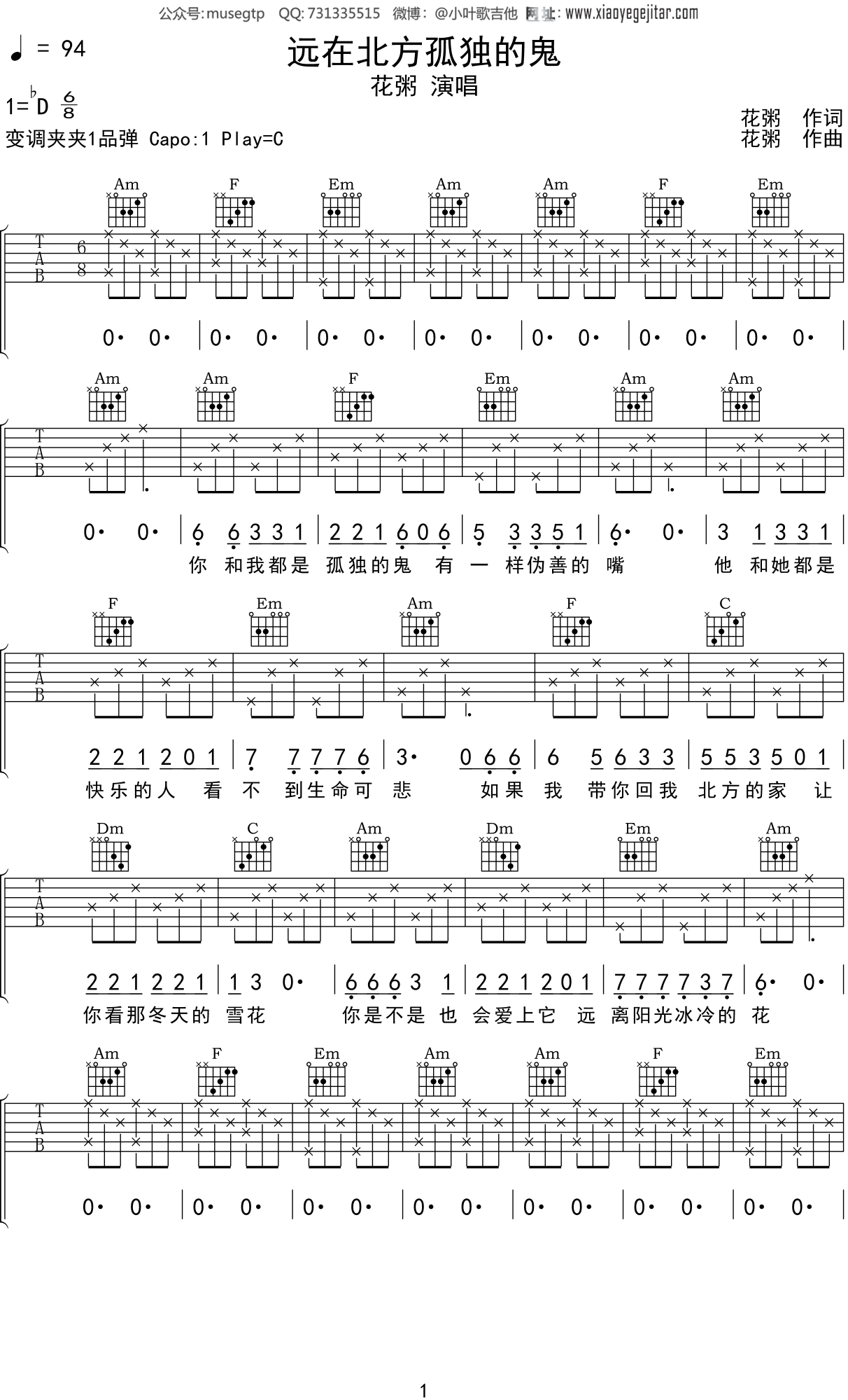 花粥《远在北方孤独的鬼》吉他谱c调吉他弹唱谱