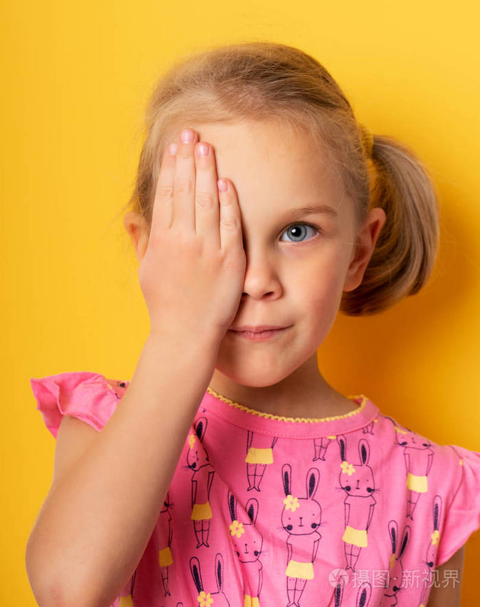 用手捂住一只眼睛的女孩.眼科概念