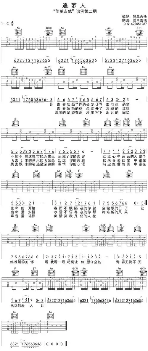 罗大佑《追梦人》吉他谱_c调_高清六线图片谱子_简单吉他编配版