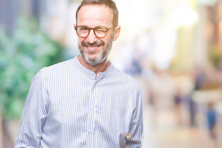 中年老人戴着眼镜,在孤立的背景下眨眼,看着镜头,的表情,开朗和快乐的
