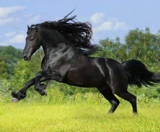 黑大衣在冬天运行驰骋运行的白色骏马驰骋两个灰色种马运行驰骋在冬天