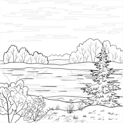 在河岸边的森林树木简笔画 手绘 线稿 13001028