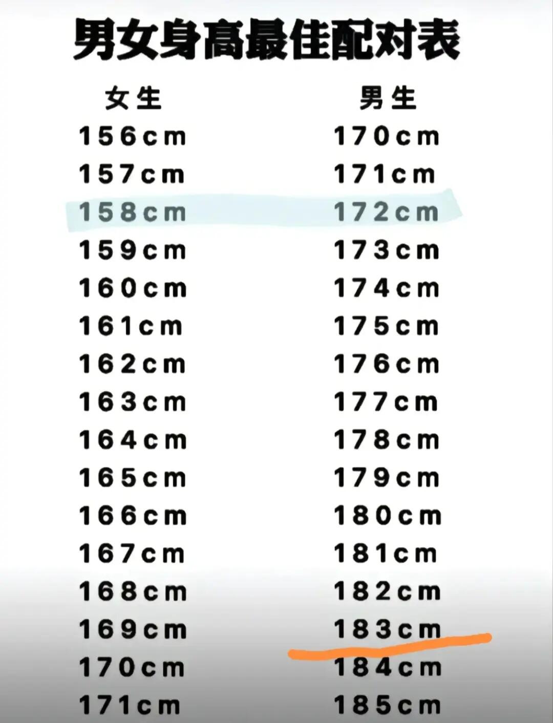 男女最佳身高配对表 现实生活真的没怎么见过比自己高很多的男生 174