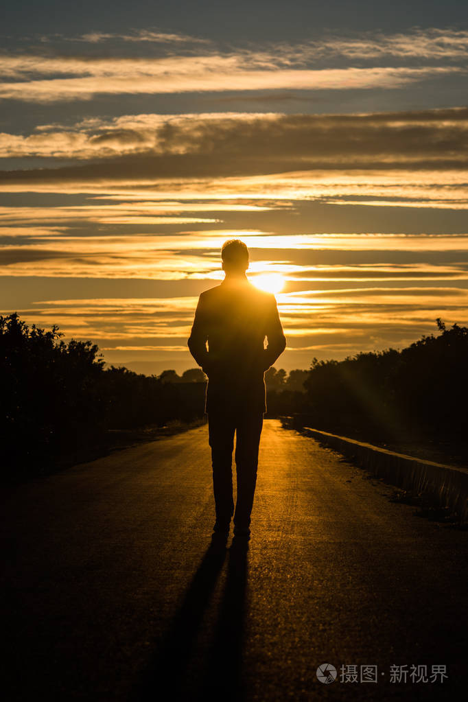 一个人走在路上,在日落时分的轮廓照片-正版商用图片0x1bhj-摄图新