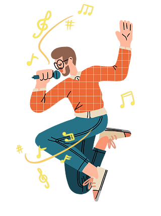 手绘音符拿着麦克风尽情欢乐唱歌的男士插画