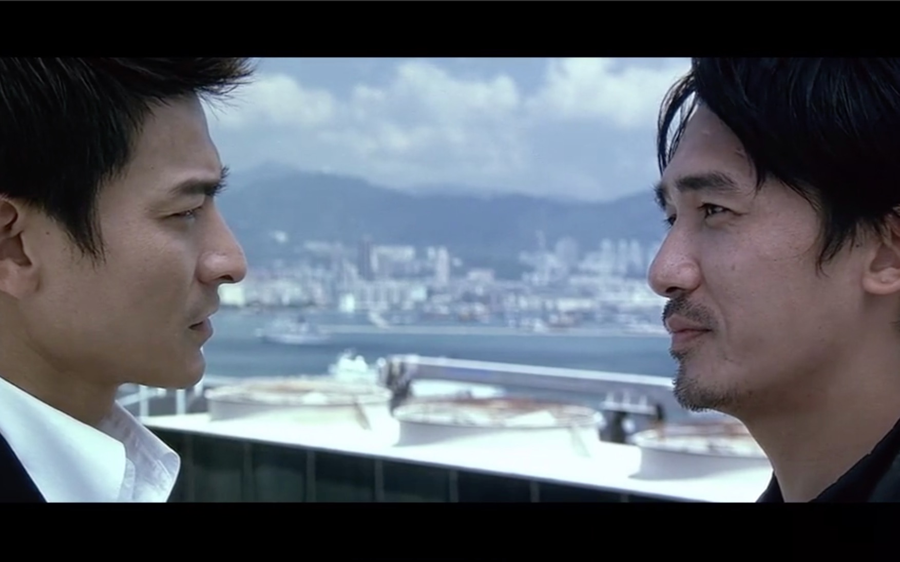 电影《无间道》中天台对峙的刘德华和梁朝伟,两人均为tvb训练班学员.