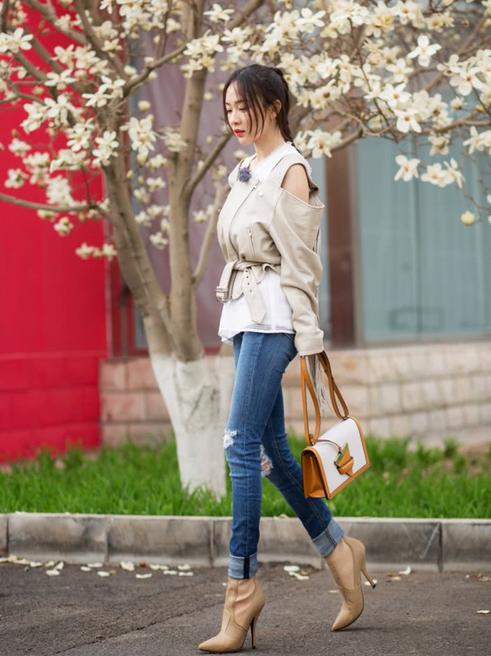 霍思燕牛仔裤搭配浅红上衣和白色紧身裙打扮棚拍定妆照什么水平