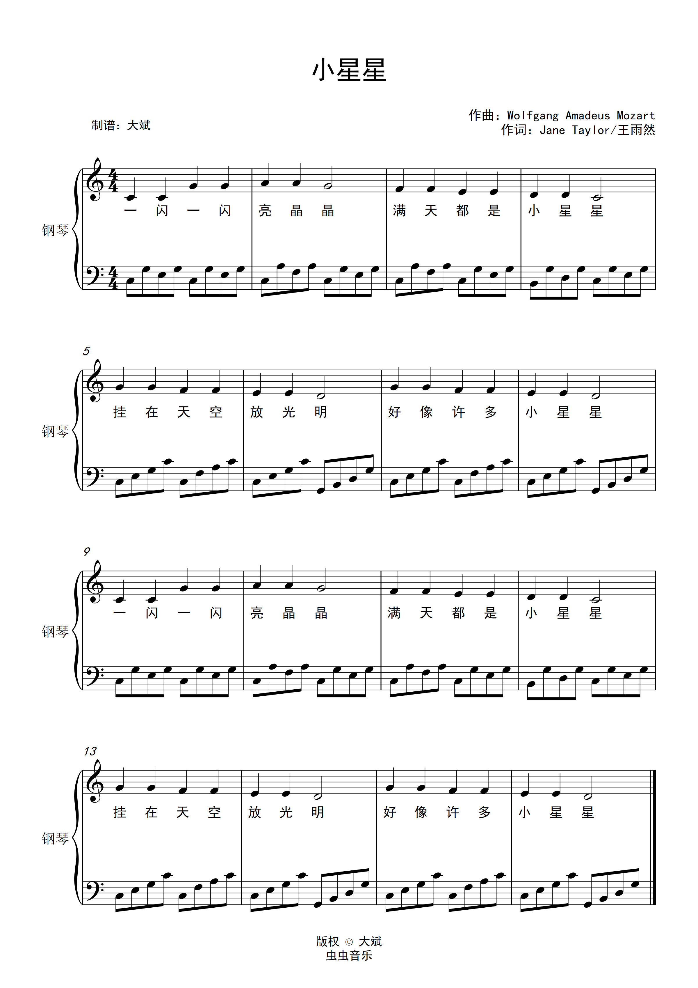 小星星钢琴谱-c调-虫虫钢琴