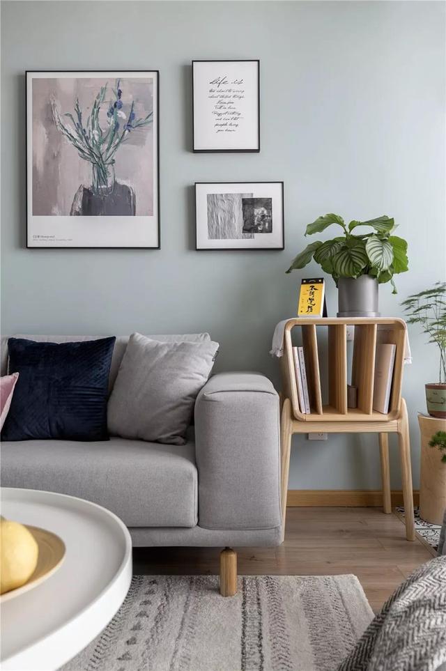 沙发背景墙上,用白色石膏线做了些方框装饰,增加了室内层次感.
