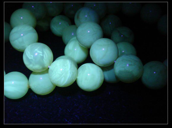 荧光下压制的二代蜜蜡不同颗粒发光效果明显差异